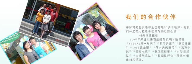 06年杭州第一家兒童專業(yè)理發(fā)服務(wù)機(jī)構(gòu)開張營(yíng)業(yè),經(jīng)過4年的發(fā)展成為杭州嬰幼兒服務(wù)最大最專業(yè)連鎖機(jī)構(gòu)之一,迄今為止已經(jīng)在全國(guó)各地?fù)碛?0多家合作店,第一家引進(jìn)來自太空的水處理系統(tǒng)--美國(guó)中央軟水處理系統(tǒng),第一家引進(jìn)開發(fā)了適合1到6歲寶寶的幼兒游泳項(xiàng)目,第一家擁有正規(guī)游泳師證書的嬰兒游泳館,第一家擁有嬰兒沖浪游泳的游泳館,第一家使用恒溫設(shè)備的游泳館。經(jīng)過幾年的發(fā)展,讓我們更懂得珍惜和感恩,愛孩子像愛自己的寶貝!