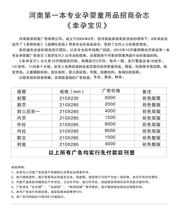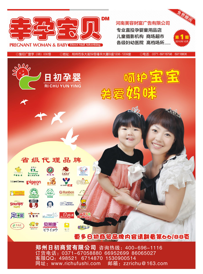 依托遍布全省的高效發(fā)行團隊,以及專業(yè)的市場推廣經驗,2010年10月重磅推出河南省第一本專業(yè)孕嬰童廣告雜志《幸孕寶貝》以專業(yè)的視角,全面服務于河南孕嬰童用品行業(yè)的各級機構。