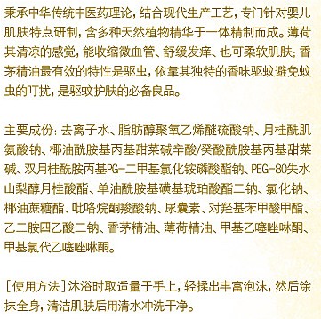 潤本草本防蚊沐浴露秉承中華傳統(tǒng)中醫(yī)藥理論,結合現(xiàn)代生產工藝,專門針對嬰兒肌膚特點研制,含多種天然植物精華于一體,精制而成。薄荷其清涼的感覺,能收縮微血管、舒緩發(fā)癢、也可柔軟肌膚;香茅精油有效特性是驅蟲,依靠其獨特的香味驅蚊,避免蚊蟲的叮咬,是驅蚊護膚的必備良品。
