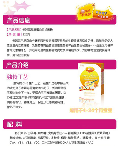 卡咪呢乳清蛋白嬰幼兒營養(yǎng)米粉是上?ㄟ淠啬笅胗闷酚邢薰酒煜庐a(chǎn)品,精選優(yōu)質(zhì)大米制作,特別添加乳清蛋白和益生元,提高寶寶抵抗力,促進(jìn)寶寶changdao的消化吸收,上市以來廣受父母消費者的青睞。