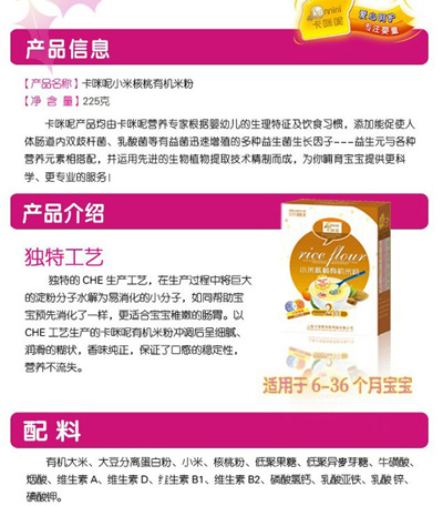 卡咪呢有機(jī)米粉系列是專為中國寶寶設(shè)計(jì)的營養(yǎng)輔食,選用有機(jī)大米,科學(xué)搭配維生素AD等維生素,還特別添加;撬帷HA、AA等有助智力發(fā)育的營養(yǎng)成分,富含15種營養(yǎng)素,F(xiàn)上?ㄟ淠啬笅胗闷酚邢薰久嫦蛉珖瞻资袌鰠^(qū)域誠招卡咪呢有機(jī)米粉代理商。