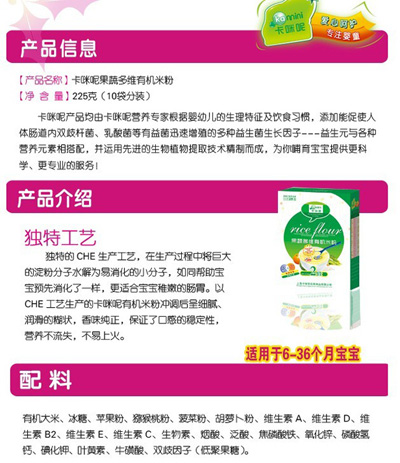 卡咪呢果蔬多維有機米粉是上?ㄟ淠啬笅胗闷酚邢薰酒煜庐a品,精選有機大米和多種新鮮水果、水彩精心研制而成,適合6-36個月的寶寶。該款產品科學配方,富含維生素A維生素D等多種維生素,還特別添加DHA、AA和;撬嵋嬷菭I養(yǎng)組合,營養(yǎng)豐富好吸收。