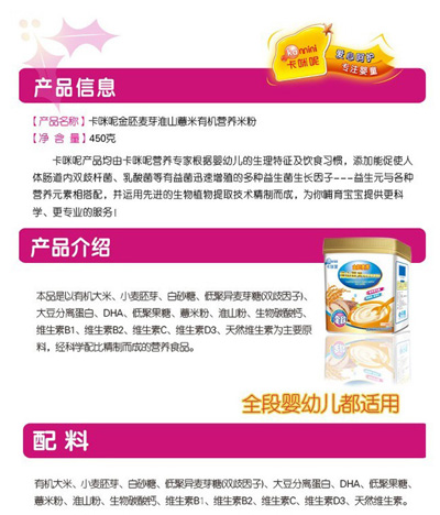 卡咪呢有機(jī)米粉系列是專為中國(guó)寶寶設(shè)計(jì)的營(yíng)養(yǎng)輔食,選用有機(jī)大米,科學(xué)搭配維生素AD等維生素,還特別添加牛磺酸、DHA、AA等有助智力發(fā)育的營(yíng)養(yǎng)成分,富含15種營(yíng)養(yǎng)素,F(xiàn)上?ㄟ淠啬笅胗闷酚邢薰久嫦蛉珖(guó)空白市場(chǎng)區(qū)域誠(chéng)招卡咪呢有機(jī)米粉代理商。