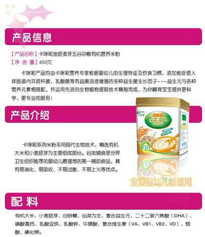 卡咪呢有機(jī)米粉系列是專為中國(guó)寶寶設(shè)計(jì)的營(yíng)養(yǎng)輔食,選用有機(jī)大米,科學(xué)搭配維生素AD等維生素,還特別添加;撬帷HA、AA等有助智力發(fā)育的營(yíng)養(yǎng)成分,富含15種營(yíng)養(yǎng)素。現(xiàn)上?ㄟ淠啬笅胗闷酚邢薰久嫦蛉珖(guó)空白市場(chǎng)區(qū)域誠(chéng)招卡咪呢有機(jī)米粉代理商。