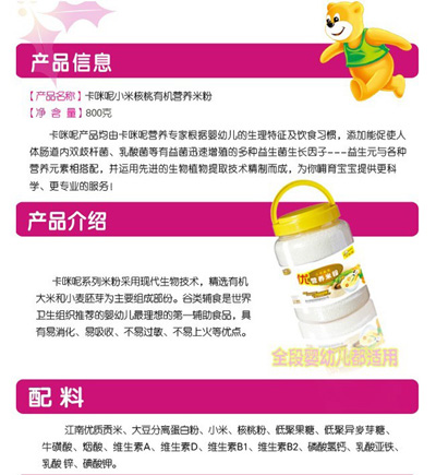 卡咪呢有機米粉系列是專為中國寶寶設計的營養(yǎng)輔食,選用有機大米,科學搭配維生素AD等維生素,還特別添加牛磺酸、DHA、AA等有助智力發(fā)育的營養(yǎng)成分,富含15種營養(yǎng)素,F(xiàn)上?ㄟ淠啬笅胗闷酚邢薰久嫦蛉珖瞻资袌鰠^(qū)域誠招卡咪呢有機米粉代理商。