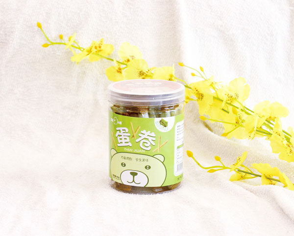 艾比小熊蛋卷系列共包含5種口味,紫薯、椰奶、香蕉、海苔、草莓;精選面粉,含礦物質、無機鹽、蛋白質,加入雞蛋液、各種果蔬汁、奶汁、海苔碎片等,經成糊、成卷、涂抹植物油烤焙而得,蛋卷色澤金黃偏向其中所加