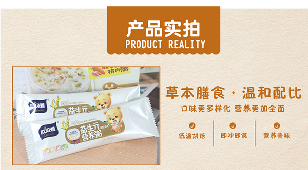 歐貝雅蛋黃玉米營養(yǎng)粥將傳統(tǒng)的營養(yǎng)米粉和聞名全國的廣東粥品完美結(jié)合起來精制而成,營養(yǎng)更豐富,口感更佳,而且免煮沖水即食,給寶寶喂食的時(shí)候不用等那么長時(shí)間,很方便。