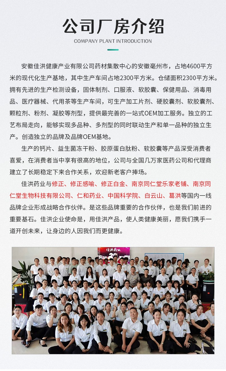 安徽佳洪健康產(chǎn)業(yè)有限公司位于全球最大的中藥材集散中心安徽亳州市,占地4600平方的現(xiàn)代化生產(chǎn)基地,其中生產(chǎn)車間占地2300平。倉儲面積2300平。國際先進(jìn)的生產(chǎn)檢測設(shè)備,固體制劑、口服液、軟膠囊、保健用品、消毒用品、醫(yī)療器械、代用茶等生產(chǎn)車間,可生產(chǎn)加工片劑、硬膠囊劑、軟膠囊劑、顆粒劑、粉劑、凝膠等劑型,提供最完善的一站式OEM加工服務(wù)。獨立的工藝布局走向,能夠?qū)崿F(xiàn)多品種、多劑型的同時聯(lián)動生產(chǎn)和單一品種的獨立生產(chǎn)。創(chuàng)造獨立的品牌及品牌OEM基地。