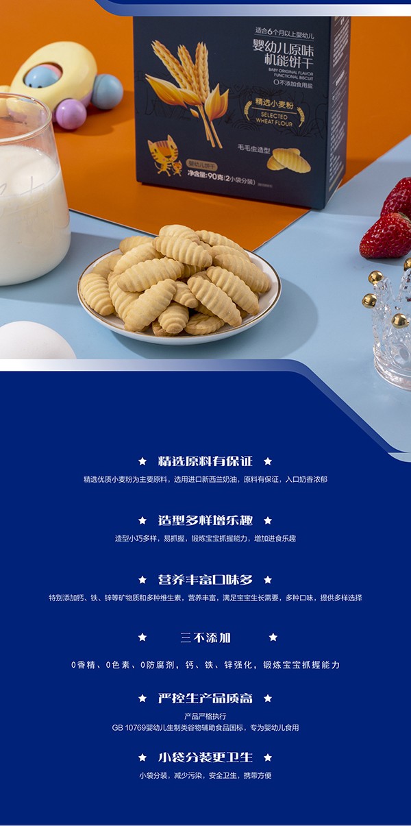 嬰標(biāo)GB-10769,不添加香精、色素、防腐劑;0添加白砂糖;0添加食鹽;鈣鐵鋅強(qiáng)化;進(jìn)口新西蘭奶油,安全健康,美味營(yíng)養(yǎng),好吃又好玩,相伴童年美妙時(shí)光!