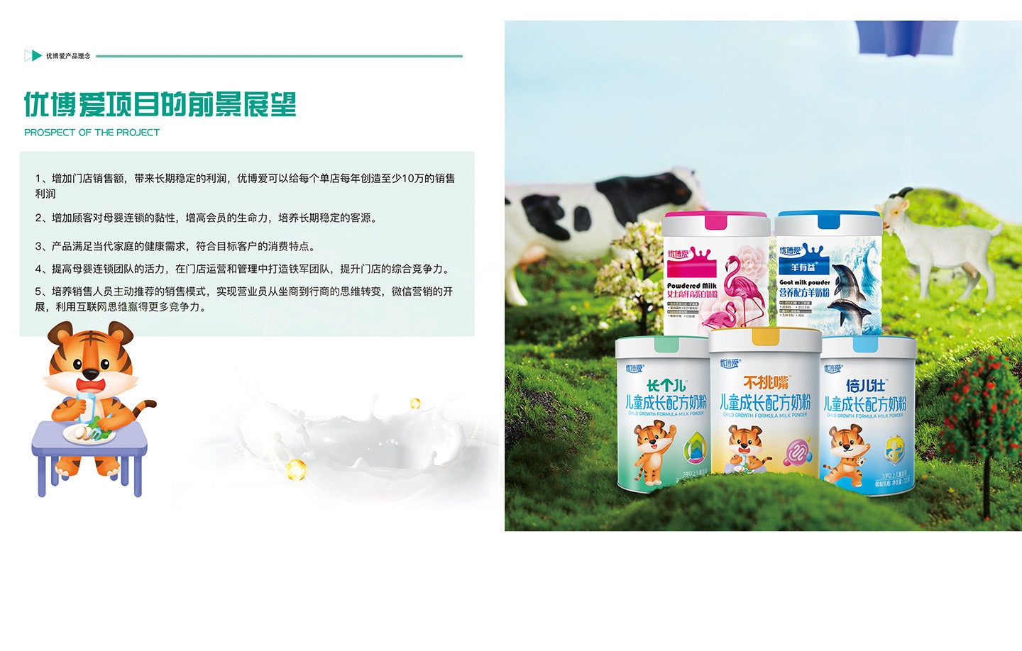 品牌名稱:優(yōu)博愛 主營產(chǎn)品:優(yōu)博愛兒童成長奶粉,女士奶粉,羊奶粉 品牌特色:精準(zhǔn)營養(yǎng)