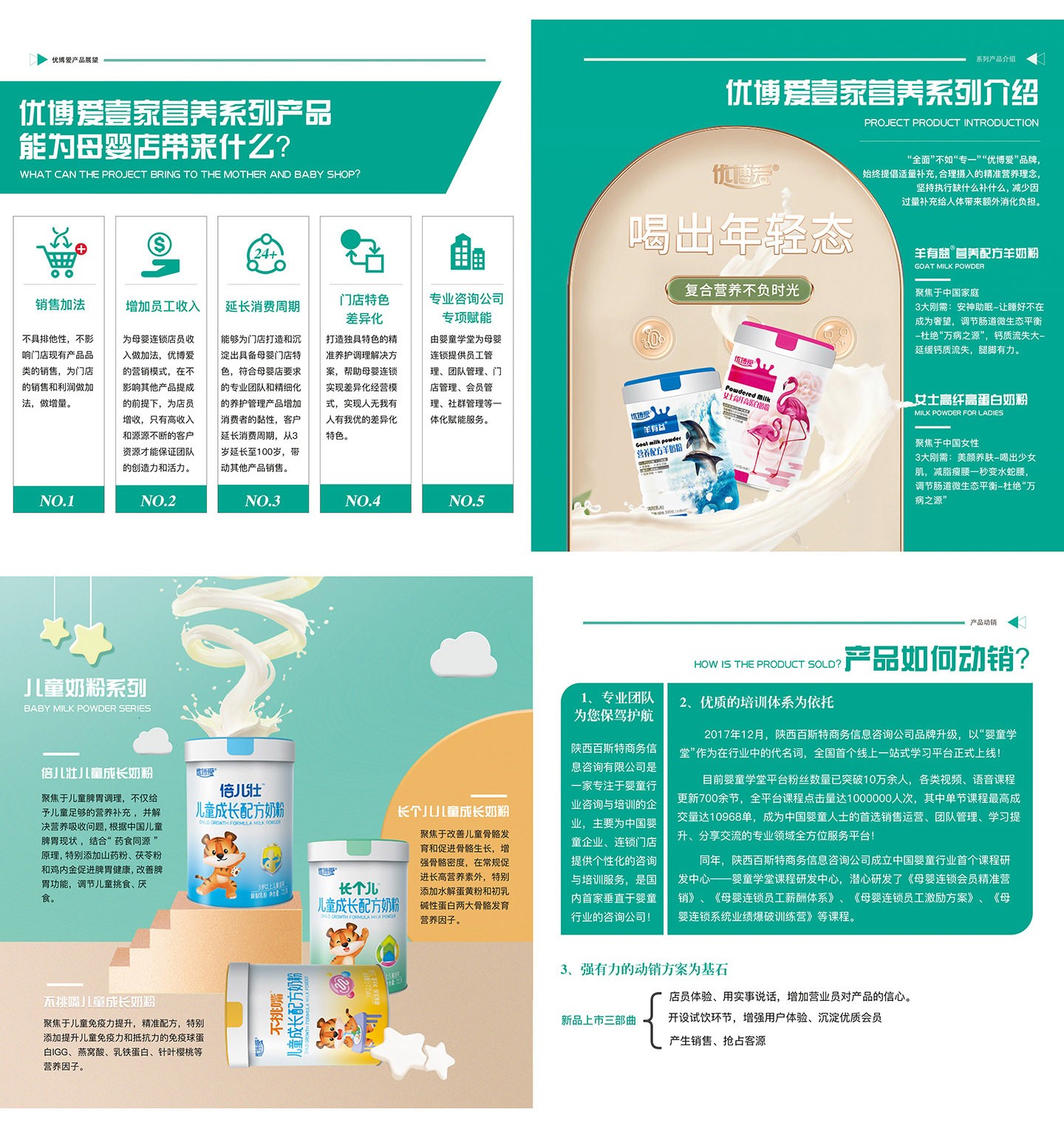 目前優(yōu)博愛旗下已擁有(不挑嘴、長個兒、倍兒壯)三款兒童成長奶粉、以及羊有益配方羊奶粉、高纖高蛋白女士奶粉。五款奶粉組合優(yōu)博愛壹家營養(yǎng)系列。
