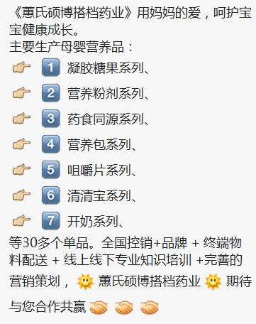 主要生產(chǎn)母嬰營養(yǎng)品︰凝膠糖果系列、營養(yǎng)粉劑系列、藥食同源系列、營養(yǎng)包系列、咀嚼片系列、清清寶系列、開奶系列等30多個單品。全國控銷+品牌+終端物料配送+線上線下專業(yè)知識培訓+完善的營銷策劃,蕙氏碩博搭檔藥業(yè),期待與您合作共贏。