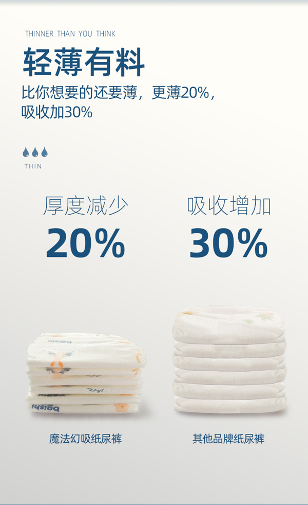 多重鎖水,干爽不潮,尿液經(jīng)3D導(dǎo)流通道快速分布下滲,雙層日本SAP高分子吸收后鎖住尿液不回滲,讓屁屁干干爽爽,,拒絕潮濕。