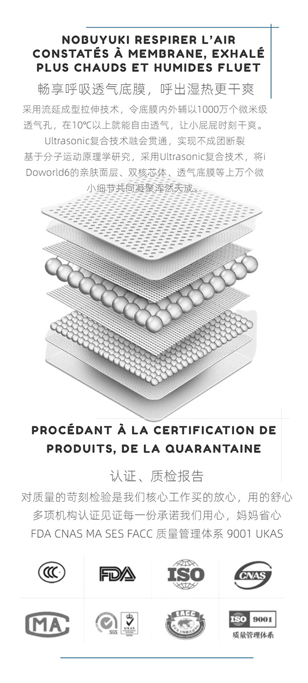Ultrasonic復(fù)合技術(shù)融會貫通,實現(xiàn)不成團斷裂。基于分子運動原理學(xué)研究,采用Ultrasonic復(fù)合技術(shù),將iDoworld6的親膚面層、雙核芯體、透氣底膜等上萬個微小細(xì)節(jié)共同凝聚渾然夭成。