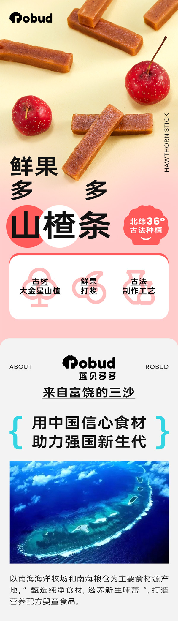 藍(lán)貝多多鮮果多多山楂條甄選古樹大金星山楂,鮮果打漿,酸甜適中,古法制作工藝,有原味、六物味、桑葚味三種不同的口味單品,配料僅山楂、白砂糖、水,不添加香精、色素、防腐劑,質(zhì)地軟糯,不傷乳牙,含豐富維生素C和天然果膠、果酸,備受小朋友們的喜愛。