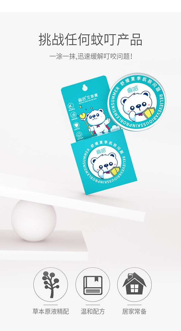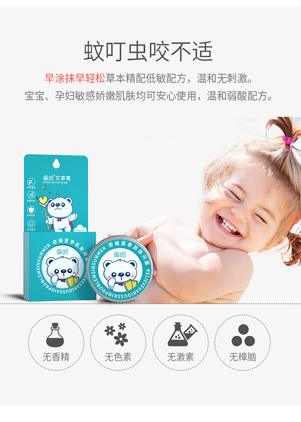 麻哈艾草膏產(chǎn)品,主要針對(duì)蚊叮后的皮膚外搽使用,可以有效的舒緩蚊蟲叮咬后的皮膚劇癢,滋潤(rùn)舒緩,微涼舒適。蚊叮蟲咬不適,早涂抹早輕松草本精配低敏配方,溫潤(rùn)無(wú)刺激。寶寶孕婦敏感嬌嫩肌膚均可安心使用,是居家常備,出游佳選。